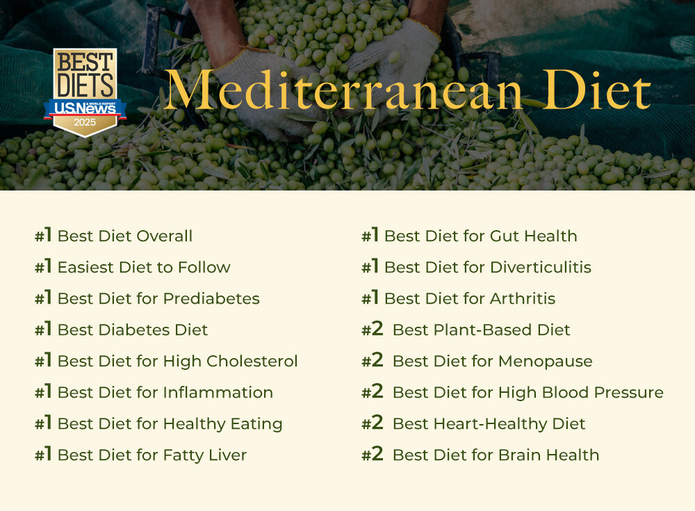 For an impressive eighth year in a row, U.S. News & World Report named the Mediterranean Diet its “Best Diet of 2025” overall. U.S. News & World Report panelists evaluated plans for nutritional completeness, health risks and benefits, long-term sustainability and evidence-based effectiveness. They also considered each diet’s strengths and weaknesses and goals each diet might be most effective at addressing.
